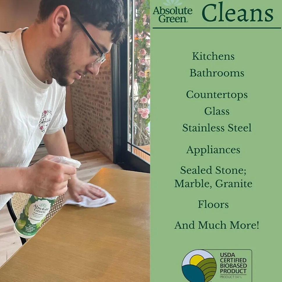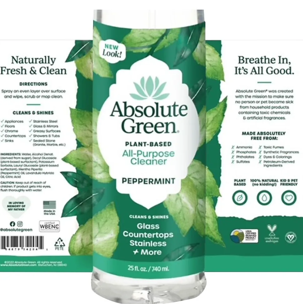 Invigorating and refreshing peppermint. Absolute Green Natural eco-friendly peppermint cleaner is made from a blend of powerful, all-natural cleaning ingredients with 100% pure and natural essential oils. This effective cleaner will leave your home/office minty fresh.Naturally repels ants, mice and spiders too!
