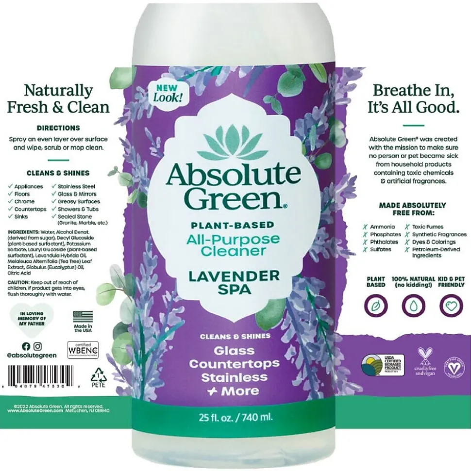 Its like a spa vacation without the travel. Eco-friendly Absolute Green Natural lavender spa cleaner is made from a blend of powerful, all-natural plant-based cleaning ingredients along with 100% pure essential oils. This multi-purpose effective herbal cleaner will leave your place sparking and add a little zen too!
