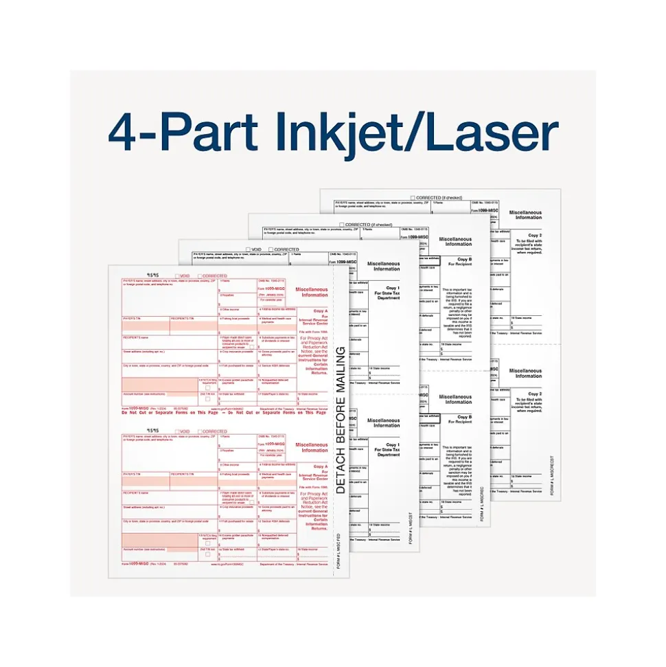 - 4-Part 1099-MISC forms print 2 to a page on 25 micro-perforated sheets with copies A, 1, B & 2