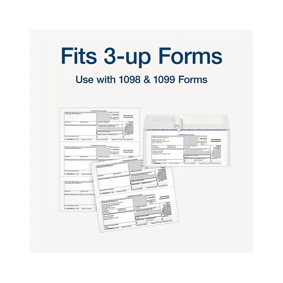 - Left aligned double windows fit your 3-up 1099 forms precisely without revealing your personal information.