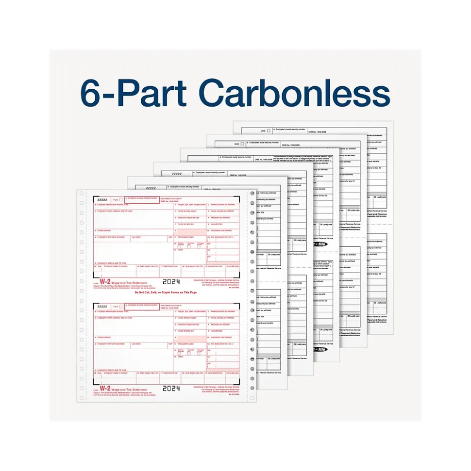 Get the 2024 IRS Form W2 on continuous feed paper for pin-fed dot-matrix printers. Pack includes 24 6-part W2s and 3 W3 forms.