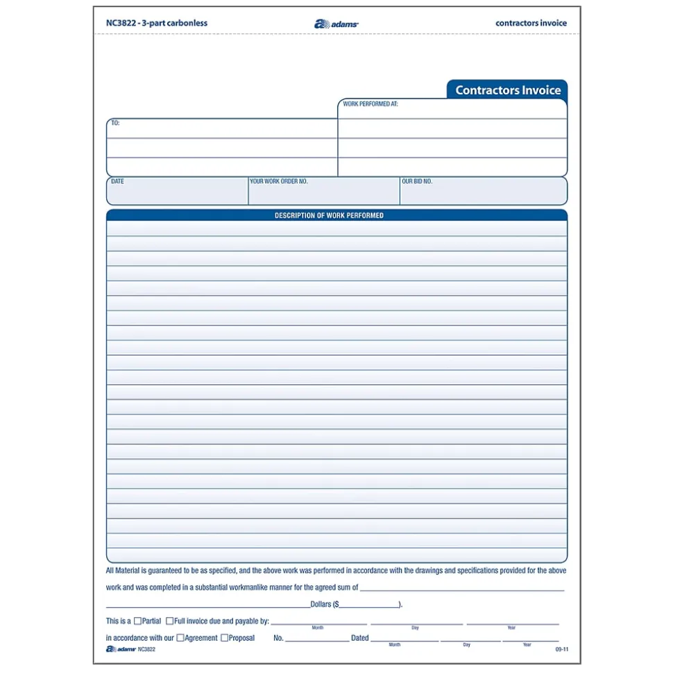 Inform clients of your terms with these contractor invoice forms. The large description area lets you elaborate on the services offered and charges, ensuring you are on the same page. These letter-size Adams contractor invoice forms feature a black header space to add a professional touch with a stamp and come with three copies for each party to promote accountability.