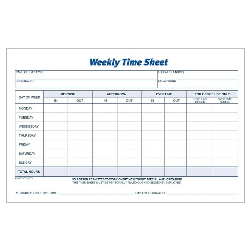 - Track weekly time, including morning, afternoon, and overtime using these time sheets