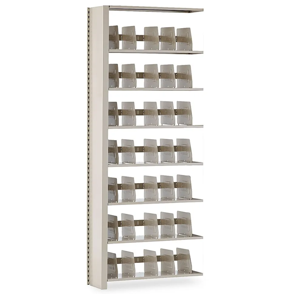 Tennsco Add-on Unit for snap-together open shelving has evenly distributed 200 lbs. to 300 lbs. per shelf holding capacity. Shelf unit with 12″ deep shelves include shelf support with five-file dividers per shelf.