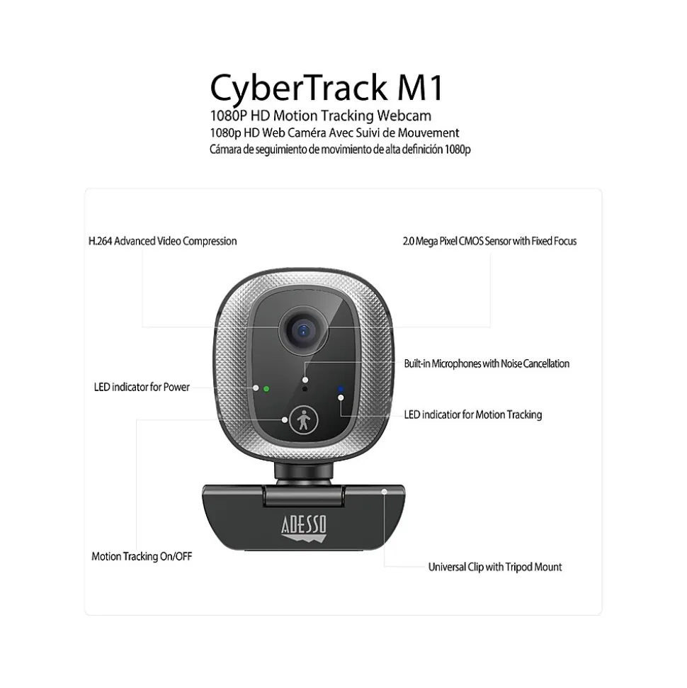 Adesso’s CyberTrack M1 is a 1080P fixed focus high resolution desktop webcam with AI Motion/Facial Tracking that can detect every step, H.264 video data compression that allows you to record and share colorful vivid HD quality video with fine detail. This webcam includes built-in dual microphones that let’s your voice be heard loud and clear, whether you are chatting with loved ones or doing business on a video call. Moreover, it also includes a Tripod Mount, with all these great features, you can easily record and transmit your videos to everyone!