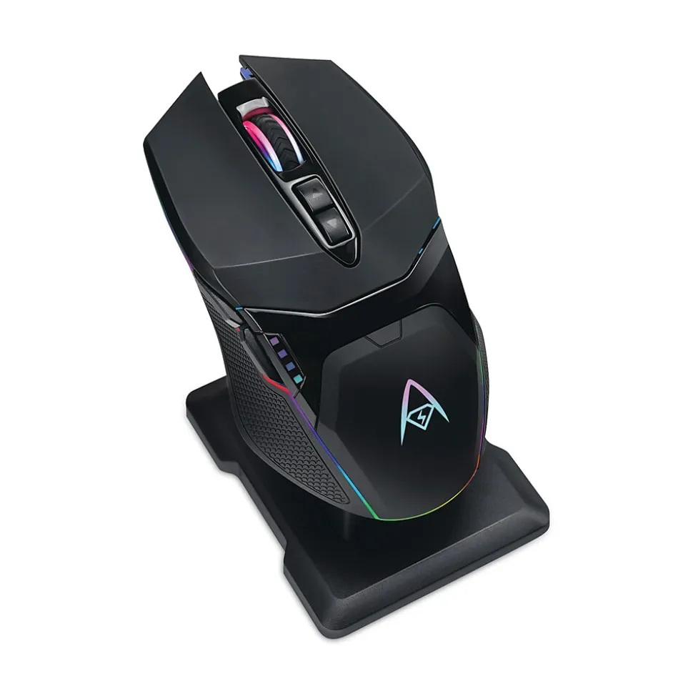 The Wireless RGB Gaming Grade Mouse is designed with 10,000 DPI to give you a fighting chance to win. The customizable lighting can be changed on the fly with our programmable driver software. Mouse also includes five custom profiles, where you are able to store your settings for different games to give you an edge over your competition. The programmable driver has a friendly user interface that lets you change lighting options and assign different functions and macros to each of the seven different buttons. The charging cradle comes with a built-in Micro USB adapter port, allowing you to charge the mouse without having to connect it to the PC.