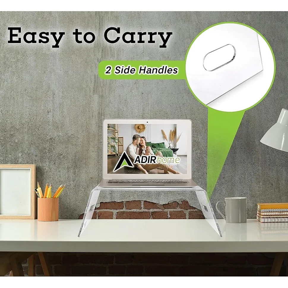 The AdirHome clear acrylic laptop and monitor stand is made to reduce eye and neck strain while accommodating a 21.5 in. wide laptop. This universal monitor stand is constructed of quality acrylic material with smooth edges and a beautiful clear platform to complement any desk or workstation. A keyboard can be stored under the AdirHome monitor stand to save desk space. Its portable mobile feature with cut-out hand holes on the sides, creates increased versatility to move your work space or leisure time wherever you need.