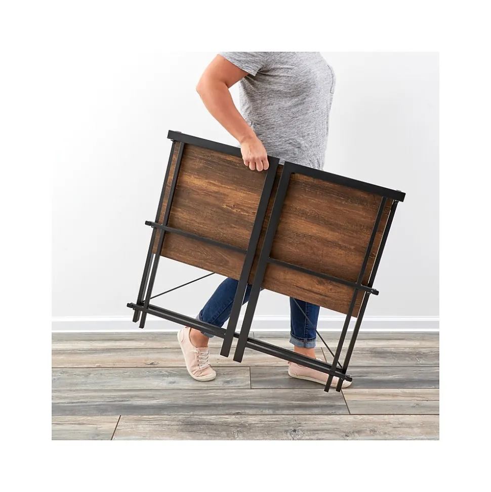 - Features industrial style, with a thick MDF panel top in a wood grain finish and heavy-duty powder-coated steel frame in black