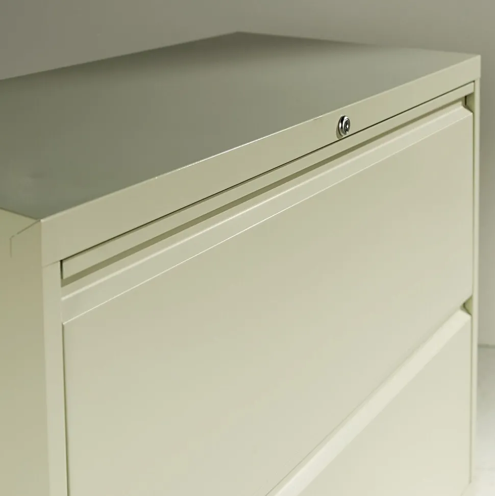 Alera® Two-drawer lateral file cabinet in light gray color features durable powder coated finish that helps to prevent scratches. Cabinet measuring 28 3/8″ x 36″ x 19 1/4″ comes with 4 adjustable leveling glides, single key core removable lock.