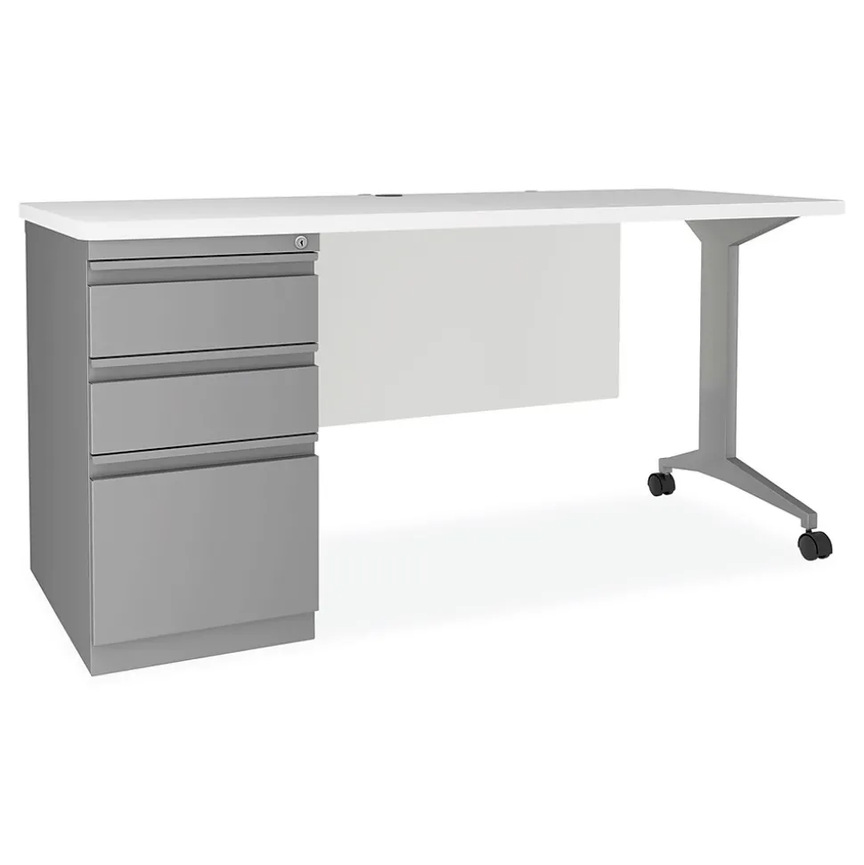 Ideal for both educational offices and classrooms, the Modern Teacher Series Pedestal Desk features a thoroughly modern design that’s as attractive as it is practical. Its durable, easy to clean, easy to disinfect laminate worksurface is supported by a swivel-caster equipped T-leg on one side and a mobile pedestal on the other, which lends the desk an airy, light appearance without compromising on functionality or maneuverability. The worksurface’s T-mold edge-band also provides an extra measure of safety, which can be very important in busy classrooms. Full-height pedestal features hidden casters and locking drawers with full-width drawer pulls.
