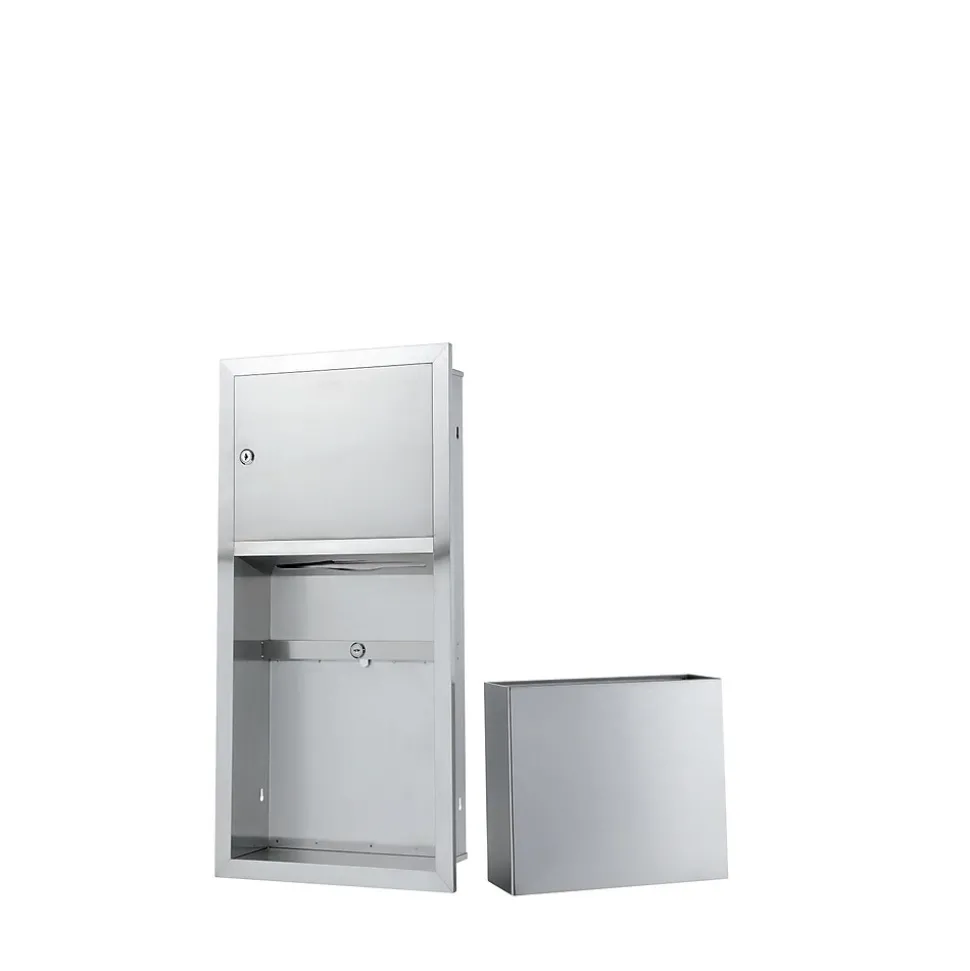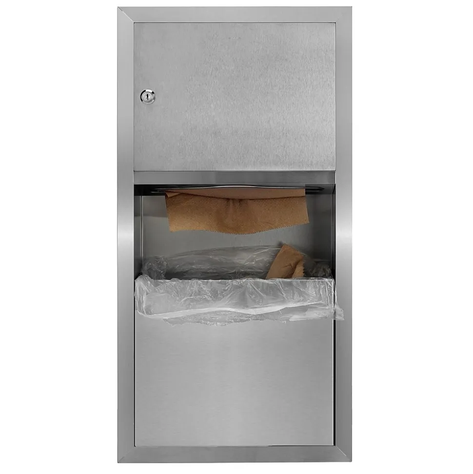 - Quick install in any restroom in-wall recessed mountable paper towel dispenser with trash receptacle