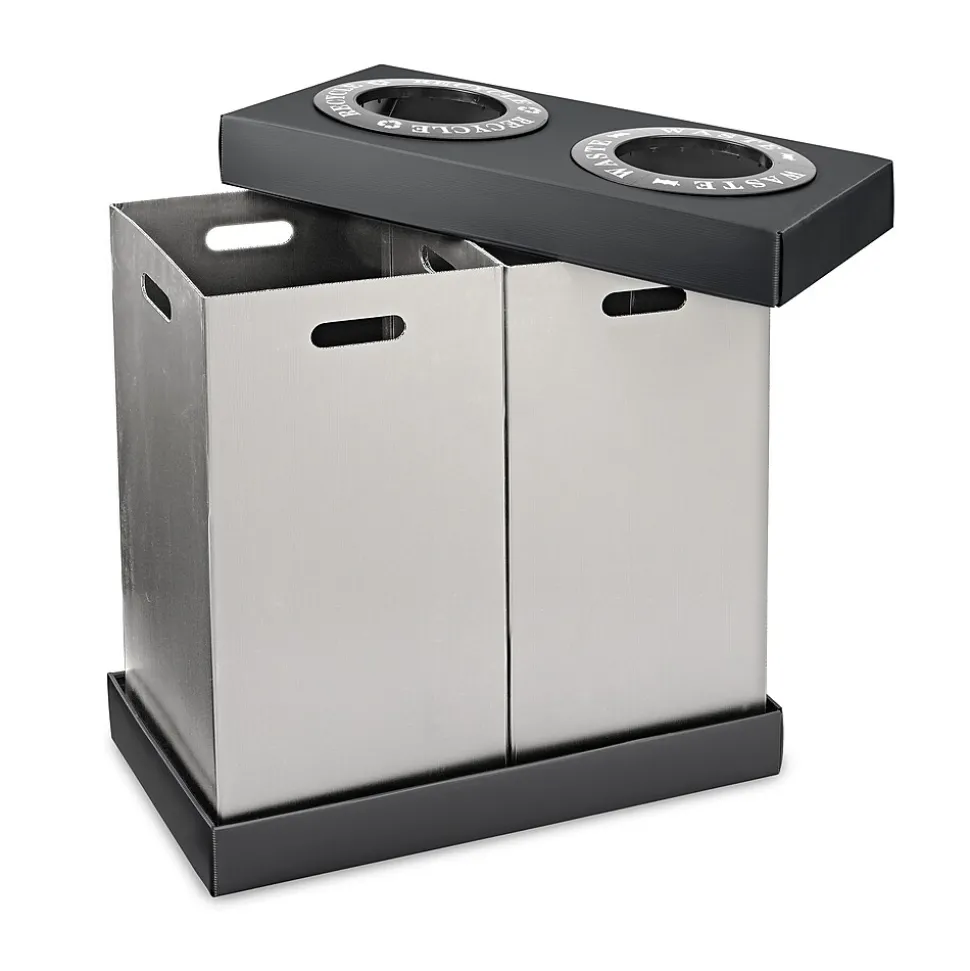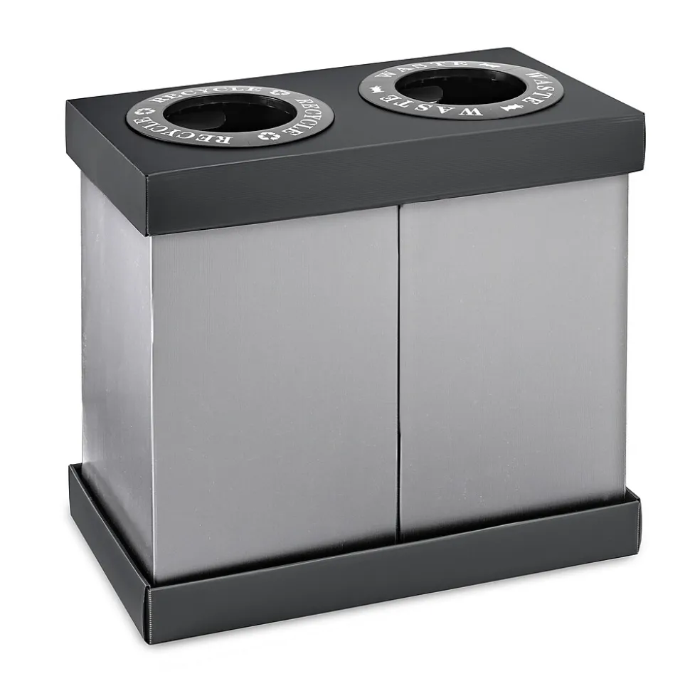 If you are looking for an attractive alternative to exposed garbage bags and other unsightly means of sorting trash from recyclables, the Alpine Industries waste and recycling bins are just the ticket. Lightweight, easily assembled and made of strong and durable corrugated plastic. Designed for indoor use in hospitality suites, meeting areas, dinners and similar venues, they perform best when bins are used as containers for disposable trash bags. Labels included for glass, plastic, paper, recyclables, cans and waste for 12 in. deposit openings.