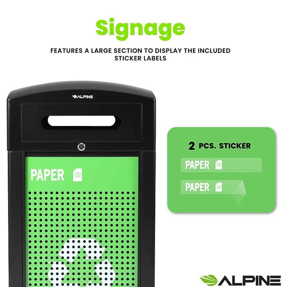 When equipping your business’s exterior with waste receptacles, you want to be reassured that it will last in the harshest weather conditions but is also aesthetically pleasing. With our 40-gallon all-weather recycling bin, you can check off both qualities. Our receptacle features a prominent white recycling symbol on the panels, a large section to display the included stickers and paper slot opening to dispose of all kinds of paper and wrappers properly. Its weather-resistant powder-coated steel frame and lid will ensure its longevity while maintaining its quality. Additionally, its solid dome lids allows rain to glide off quickly and not pool, decreasing the likelihood of corrosion. The included heavy-duty plastic interior bins will securely hold trash bags without worrying about leaks. Since your terrain isn’t always guaranteed to be perfectly flat, we have outfitted our trash container with adjustable legs. They will help certify stability and support on uneven surfaces. The Alpine recycle outdoor receptacle is vital to keeping your facilities clean and elevating your aesthetic. We understand that sometimes things happen, such as theft or vandalism; therefore, we’ve equipped each trash container with a lock and key to help protect your investment. Includes two chain-link security chains that prevent your lid from falling when opened.