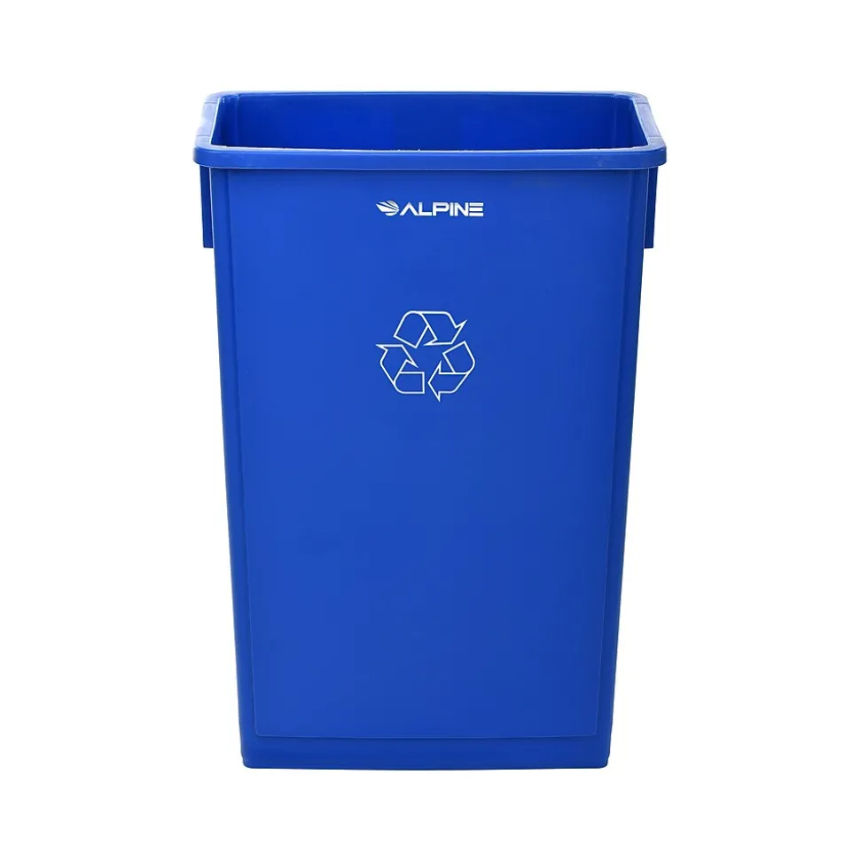 The Alpine 23 gal. blue indoor trash container is stylish and compact, making it easy to fit into any office or commercial space. This recycling trash can features a large and clear print label, making it a noticeable trash disposal solution even from far away. Designed with anti-jam reinforcements for easy trash disposal, this trash can is great for small- to medium-traffic areas in the home or office.
