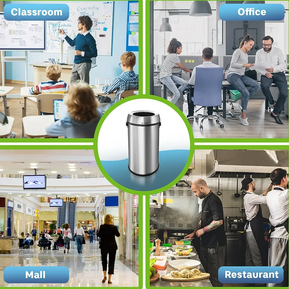 In high-traffic areas, you want to ensure that the unpleasant chore of dispensing and removing waste is as effortless as possible. Simple yet stylish, the ADA compliant, Alpine Industries Stainless Steel Open Top Trash Can boasts numerous amenities that fit the bill. For starters, the trash can is durably constructed using brushed stainless steel to provide long-term strength and use for years to come. The sturdy material holds up extremely well against everyday wear and tear, and is smudge-resistant so that it always looks clean and fresh. Measuring 27.1″ H x 16.5″ W x 15.7″ D, this 17-gallon trash can is ideal for any high-traffic public or commercial area, including restaurants, hospitals, healthcare facilities, schools, food service facilities, restrooms and more. The large capacity conveniently holds more garbage so more time can elapse between bag changes.
