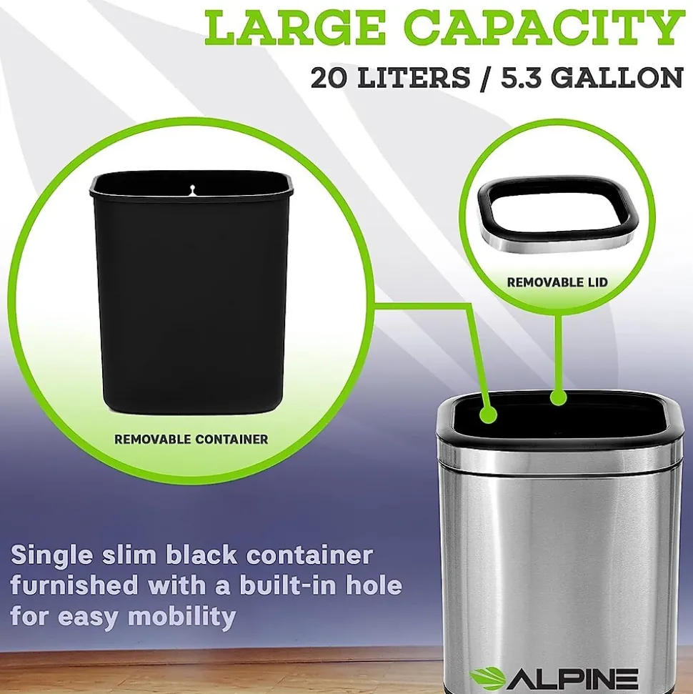 - Alpine’s Stainless Steel Trash Can boasts an open top with a wide opening to fit large, bulky items for quick and clean disposal with a 5.3 gallon capacity