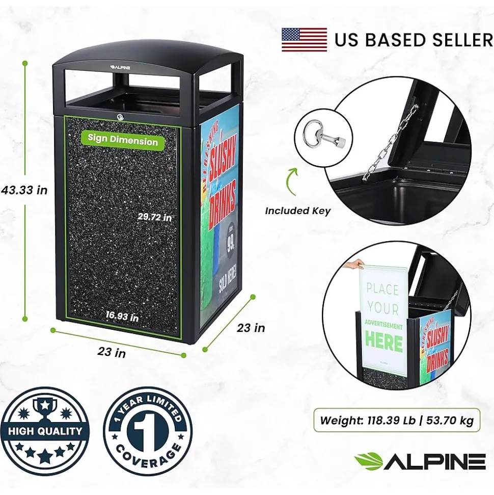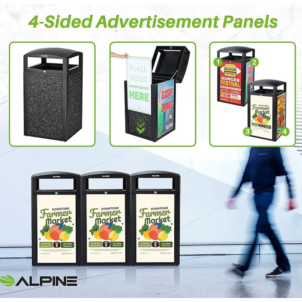 When equipping your business’s exterior with waste receptacles, you want to be reassured that it will last in the harshest weather conditions but is also aesthetically pleasing. With this Alpine rugged 40 gal. all-weather trash container with advertisement panels, you can check off both qualities and advertise while keeping your grounds well-equipped.