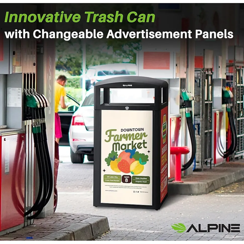 - Trash can with advertisement panels lets you dispose of waste items efficiently
