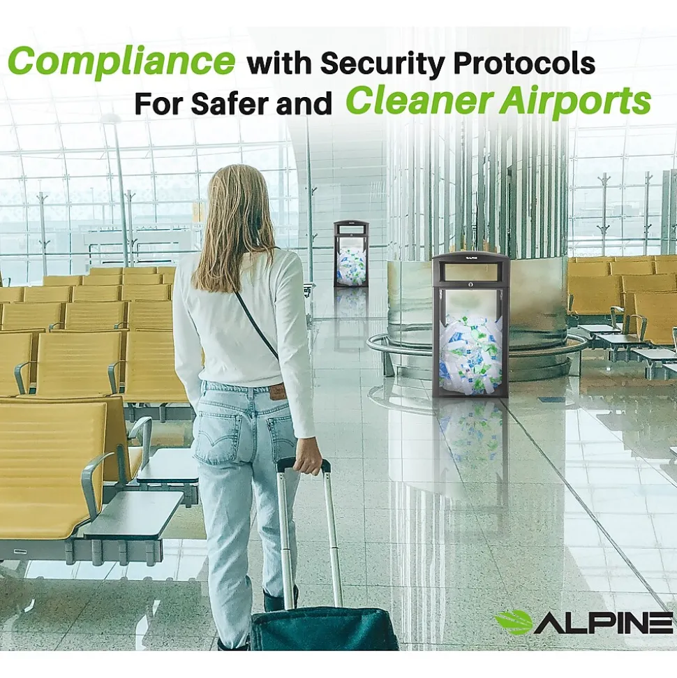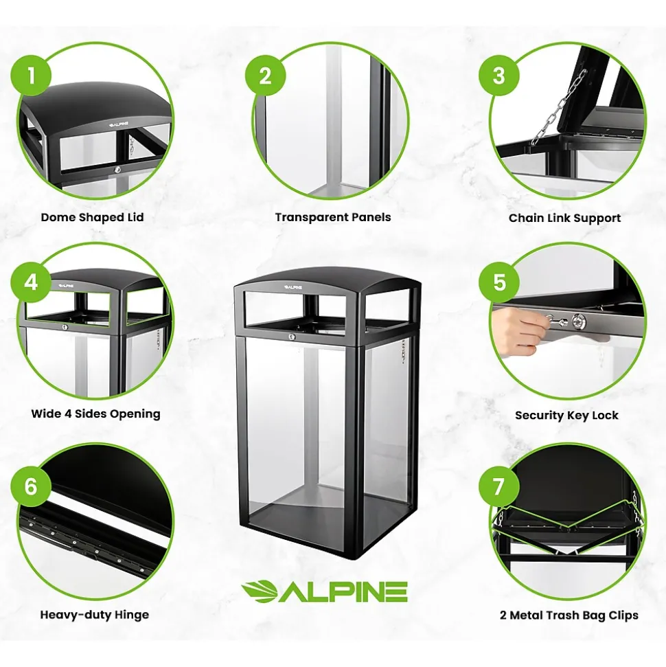 Alpine designed this DHS-compliant 40 gal. waste receptacle with transparent panels that provides security, durability, and visual appeal. To provide clear visibility to the contents of the trash can, Alpine has made the panels transparent. Law enforcement, protective services, and maintenance staff can see what’s inside and how full the can is. The dome-shaped lid prevents heavy items from being rested on top of it. The affixed lock on the lid prevents tampering, vandalism, and large objects from being inserted into the trash can. The lid’s heavy-duty hinge with attached safety chains controls how far back it can be opened. Inside are two metal clips located on both sides to securely hold your trash bags in place, even when filled. Since surfaces may be uneven, resulting in a tilted waste receptacle, Alpine has included adjustable legs that allow you to customize the height of each leg. Thanks to the substantially sized 40 gal. all-weather trash container, you can service a greater volume of foot traffic. This trash receptacle is vital to keeping your facilities clean in conjunction with elevating your aesthetic and maintaining safety for your passengers. It’s a no-brainer to outfit your commuter rail and subway systems with Alpine’s trash container with all these fantastic features.