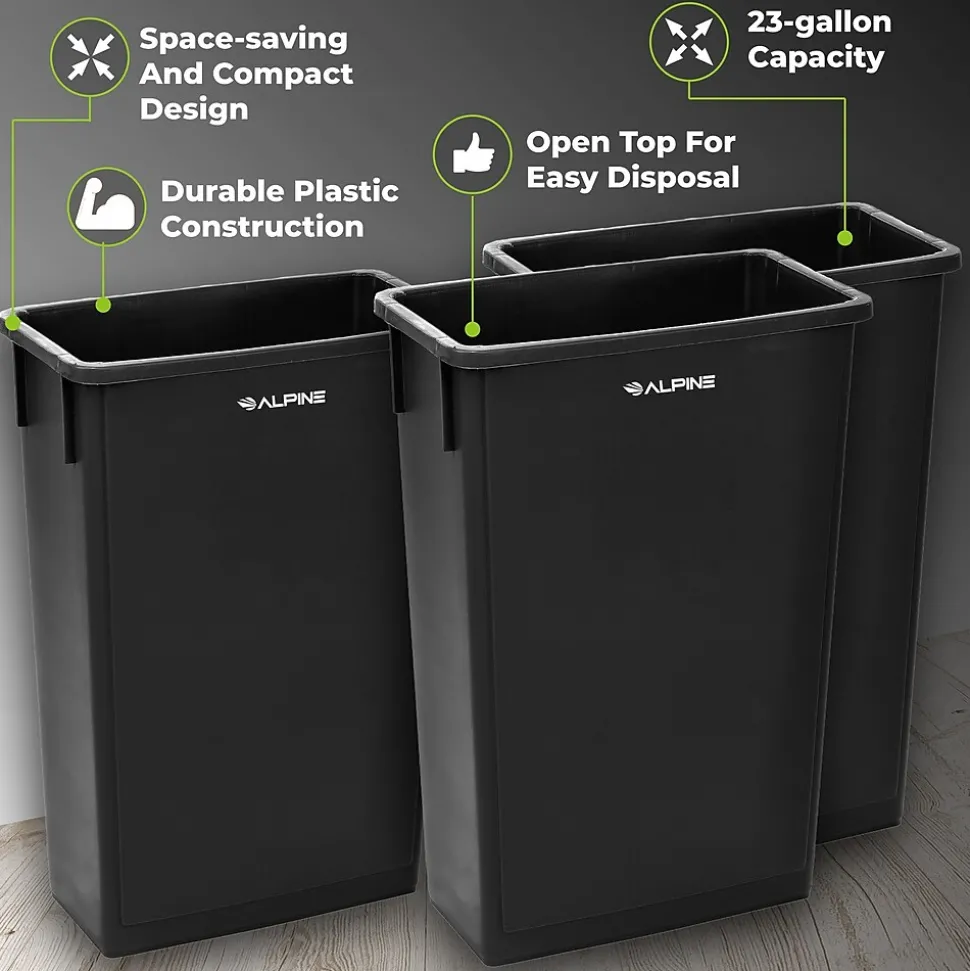 Alpine Industries 23 Gal. Black Waste Basket Commercial Trash Can is stylish and compact, making it easy to fit into any office or commercial space. This black trash can features a large and clear print label, making it a noticeable trash disposal solution even from far away. It’s conveniently designed for function and can handle a beating. Designed with anti-jam reinforcements so you can easily throw trash away quickly and easily. Great waste basket for small to medium traffic areas in the home or office.