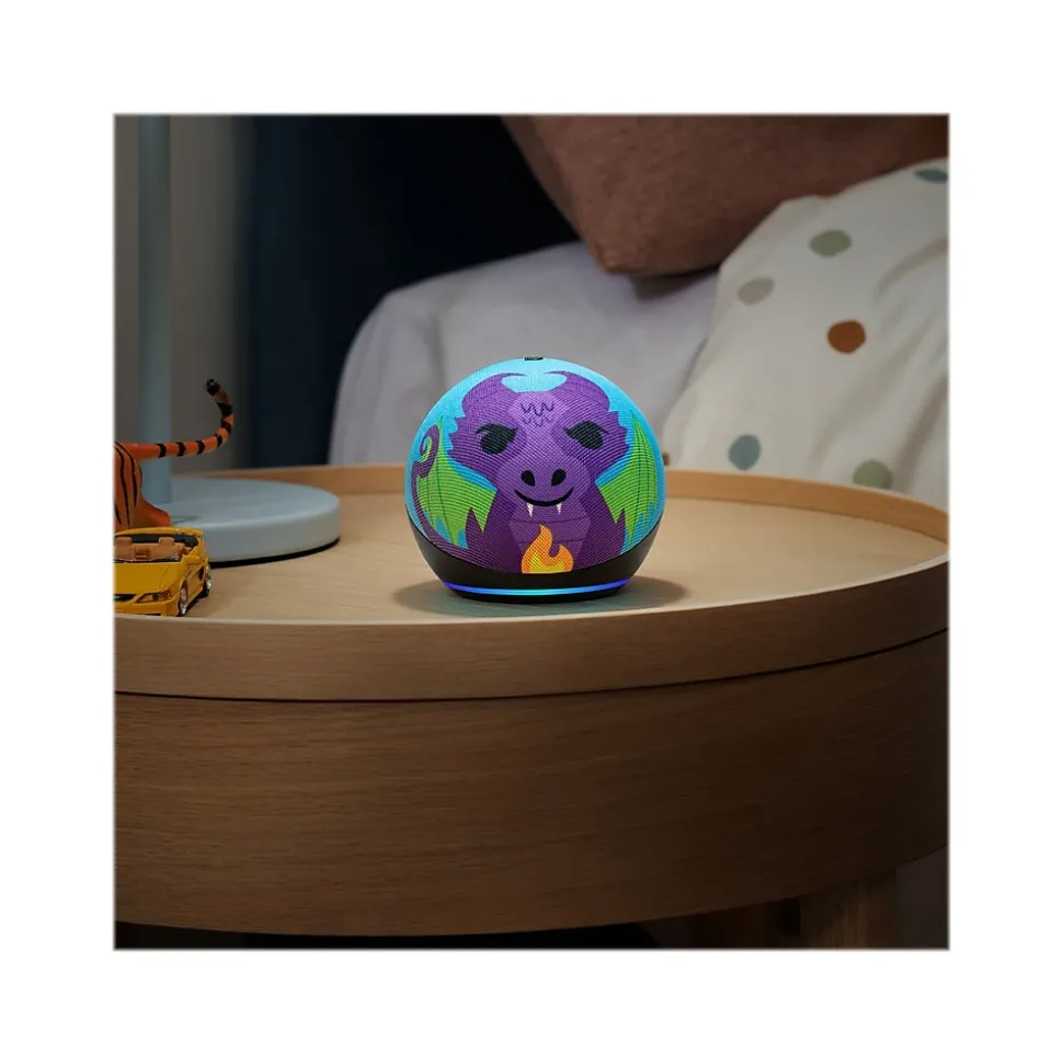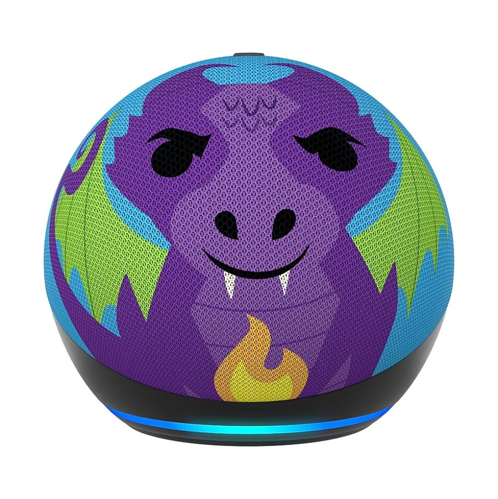 Meet Amazon Echo Dot 5th Gen Kids Dragon – Amazon’s popular and incredibly cute smart speaker with Alexa. The fun design features an improved speaker, delivering clear vocals and vibrant sound. Kids can ask Alexa for homework help, to play music, read bedtime stories, and more.