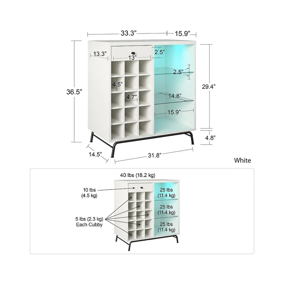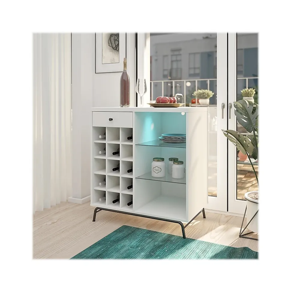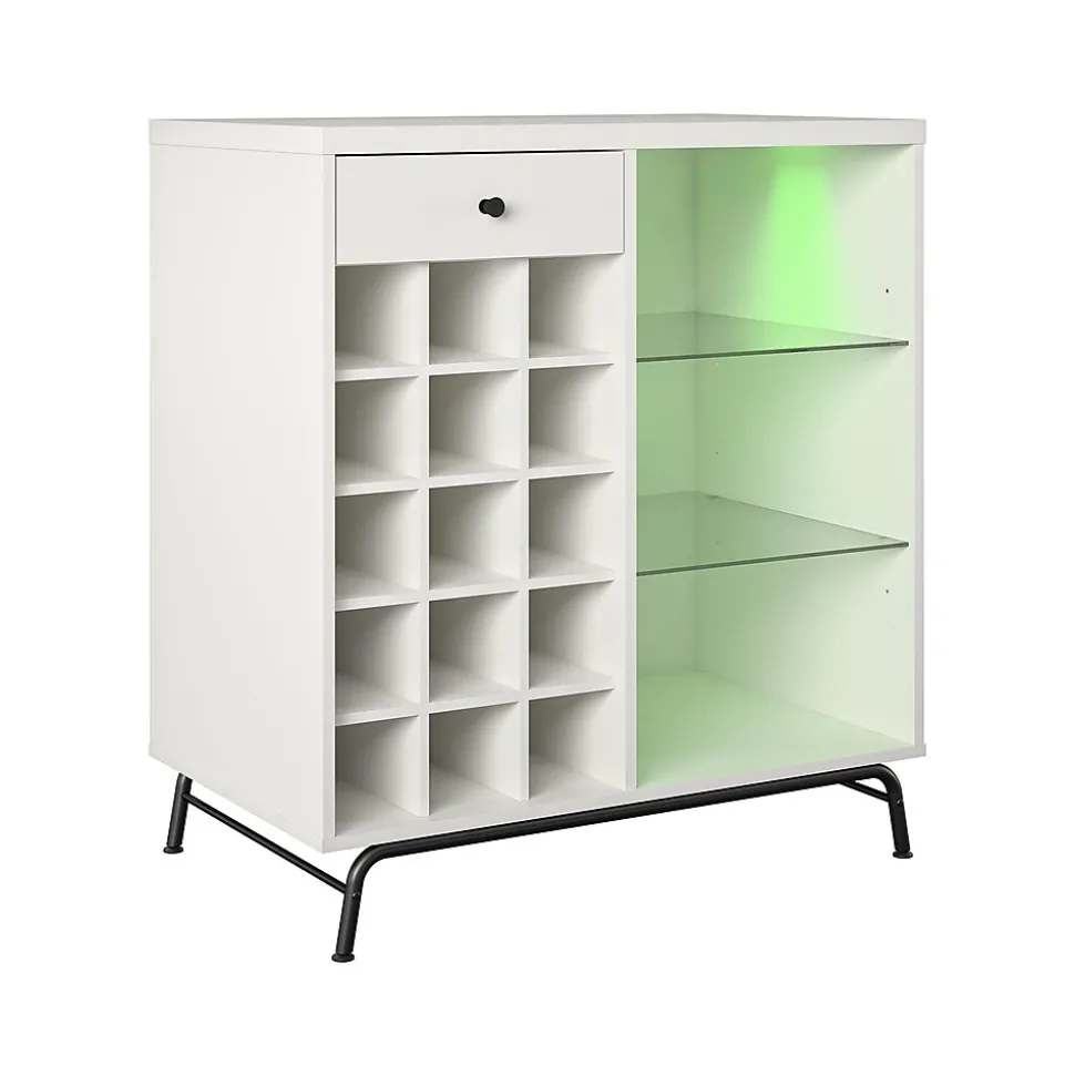 Step away from the ordinary and give your entertainment space a modern makeover with the Ameriwood Melbourne bar cabinet. This beverage cabinet features LED lighting with seven different color settings for a fun and funky look for your entertainment space. But the modern touches don’t stop there. The three open shelves (two glass) can organize glasses, tumblers, and mixers, so you have everything you need to get the party started. The 15 open bottle cubbies will offer plenty of space to organize your wine and liquor bottles. The drawer is perfect for storing away utensils, napkins, and other party supplies. This cabinet features a mix of white laminated particleboard and MDF with metal feet and tempered glass shelving. The cabinet ships flat to your door and requires assembly upon opening. Two adults are recommended to assemble.
