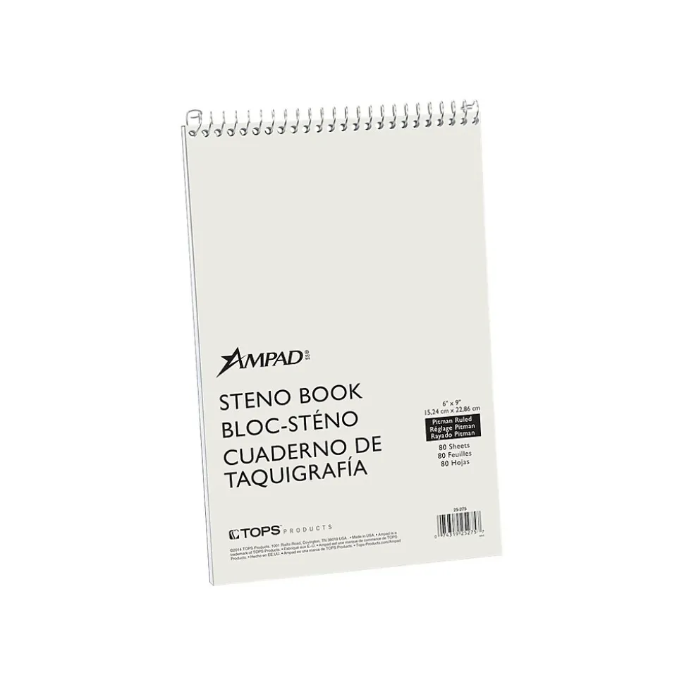 Organize lists and other information with this top-bound steno notebook. Featuring perforated sheets, this notebook lets pages easily detach while preventing damage to other papers, and the no-snag coil reduces catching on clothing or pages. This Ampad 80-sheet green-tint steno notebook is Pitman-ruled, providing plenty of space for writing lists, records, and other notes.