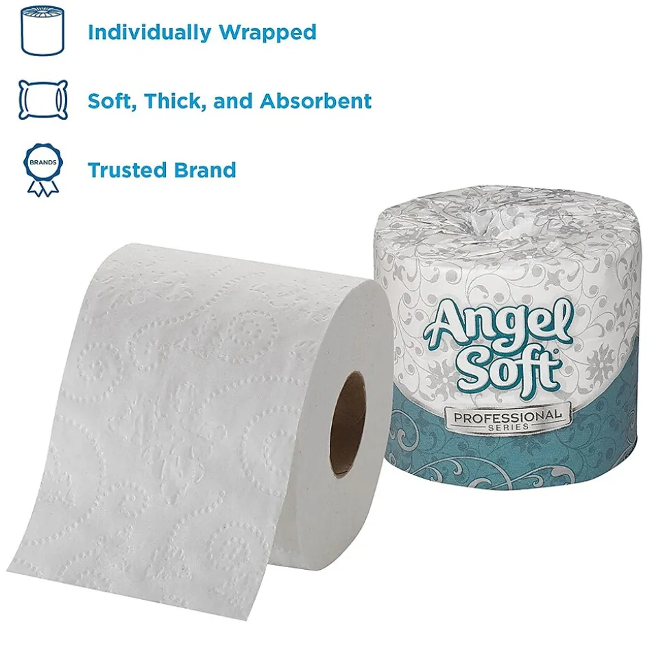 Treat customers and staff to a premium tissue with Angel Soft professional series toilet paper. An embossed design adds a hint of upscale style to every square, while the soft, absorbent texture works to keep skin dry. This toilet tissue is safe for use in all sewer and septic systems, so you can feel confident stocking your office washrooms with these rolls. Each case contains 80 rolls of Angel Soft professional series toilet paper, giving you an easy way to maintain your restroom supply stock levels.