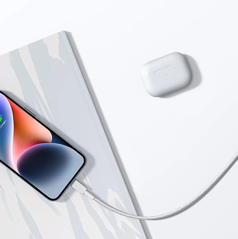 Sync and charge your iPhone with the Anker Bio-Braided USB-C to Lightning Cable. Giving you a 6′ length, you have ample slack to run the cable through your entertainment center, your desktop setup, and even in your vehicle. The white braided jacket adds a protective layer around the cable while also adding a sense of style.