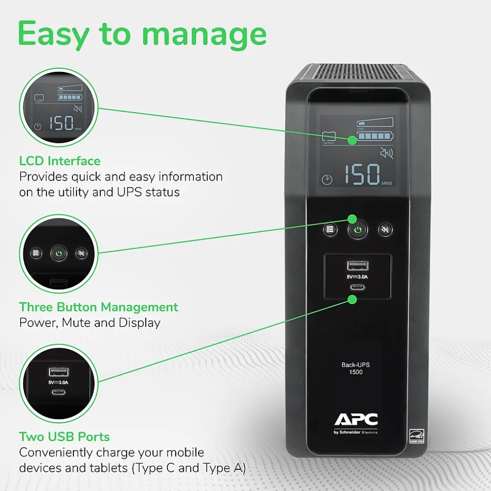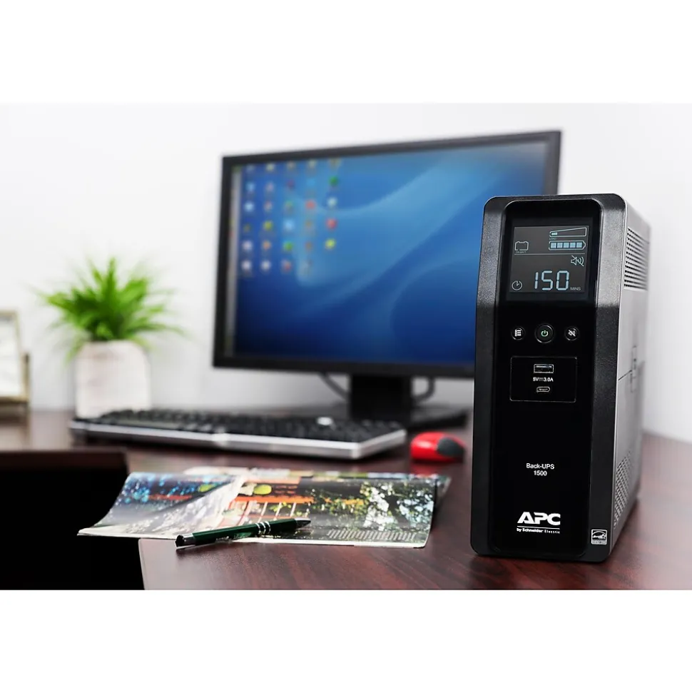 Protect networks from brownouts and blackouts with this 900-watt power supply. Alarm notifications occur via LCD display and audio so you don’t miss them, and it informs you of wall wiring defects so preventive electrical fixes can be made. This APC Back-UPS corrects low and high voltage swings without expending battery power. The BN1500M2 UPS protects connected devices from dangerous surges or spikes in voltage. Automatic Voltage Regulation (AVR) technology consistently maintains safe voltage conditions without draining the battery, saving backup run time for power outages. The BN1500M2 also provides 1Gb dataline surge and spike protection for telephone, Ethernet, and coaxial cable connections.