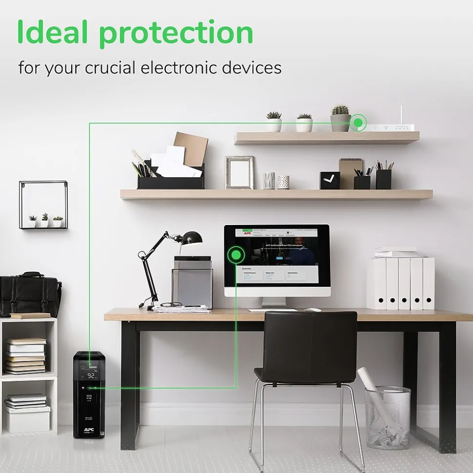 The APC Back-UPS Pro models provide premium battery backup and surge protection. Ideal for home or small office electronics, networking devices, gaming PCs and consoles. APC Back-UPS Pro models provide sinewave output, USB charging ports for your mobile devices, and increased runtime for your critical electronics. Power and protect critical electronics and stay connected to the internet during outages, surges, and lightning. Ideal for home office electronics, small to medium office electronics, networking devices, gaming PCs and consoles. APC Back-UPS Pro models provide USB charging ports for your mobile devices, active PFC compatibility and increased runtime for your critical electronics.