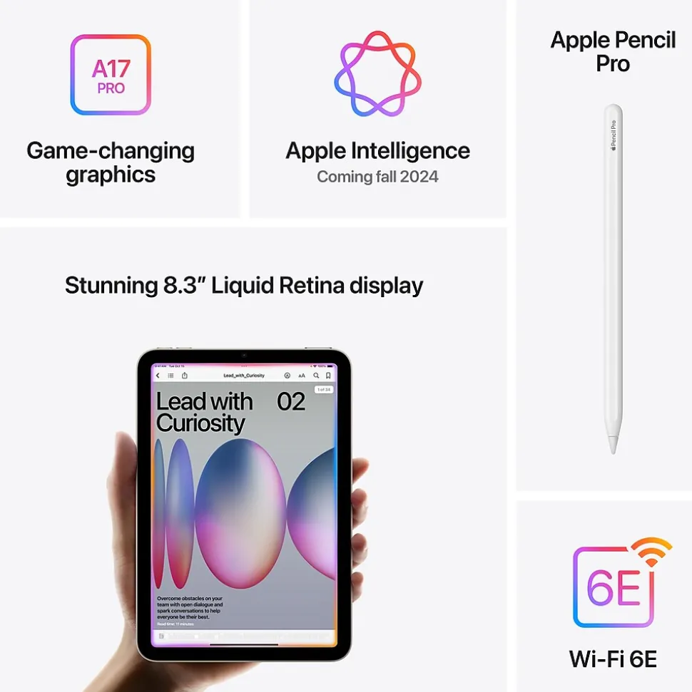 - PERFORMANCE AND STORAGE: The A17 Pro chip delivers powerful performance and ultrafast graphics for gaming. And with all-day battery life, iPad mini is always ready for any task or project. Storage starting at 256GB for all your apps, music, movies, and more.