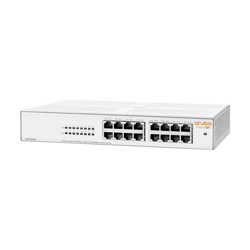 The Aruba Instant On 1430 switch series is an unmanaged Layer 2 Gigabit Ethernet switch series ready to deploy in seven models in PoE and non-PoE configurations: one (1) 5-port, two (2) 8-port, two (2) 16-port, one (1) 24-port, and one (1) 26-port model with 2 SFP uplinks models. The Aruba Instant On 1430 switch series models are easy to use with zero configuration and no required ongoing administration. The unmanaged PoE models deliver fully automated support for powering compatible IP phones, video surveillance cameras, or wireless access points. The Aruba Instant On 1430 switch series supports Energy Efficient Ethernet (EEE) and is compliant with 802.3az standard requirements to save energy during periods of low data activity. All models are fanless for silent operation in office settings or acoustically sensitive environments and require less power to operate.