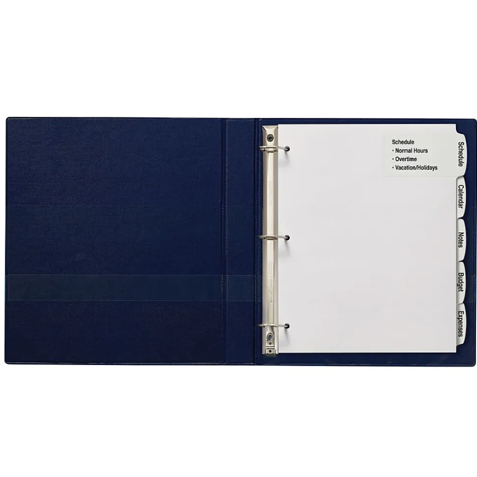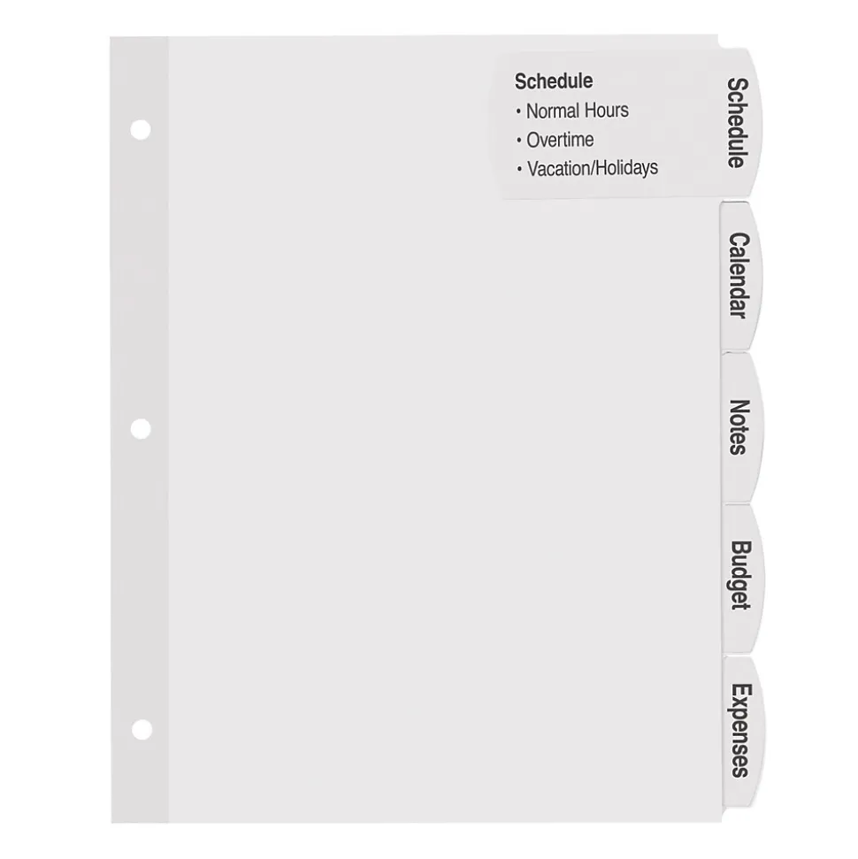 Create customized dividers with all the information you need, using these Large White Label Tab Dividers. The large labels extend from the arched-shaped tabs onto the divider bodies, giving ample room to add section contents, logos or designs. Simply personalize your tab labels using our free templates and designs at avery.com/print. You can print your labels in black and white, or create a custom color set, using a laser or inkjet printer. The print-to-the-edge Easy Peel(R) labels, featuring our Pop-Up Edge(R), make it fast and simple to personalize your tabs, with no inserts required. You simply bend back the label sheet, peel your label and apply to the divider tabs. A bonus standard label sheet is included for the back of your tabs.
