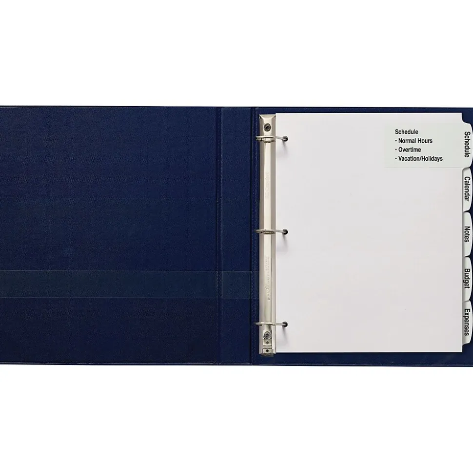 Create customized dividers with all the information you need, using these Large White Label Tab Dividers. The large labels extend from the arched-shaped tabs onto the divider bodies, giving ample room to add section contents, logos or designs. Simply personalize your tab labels using our free templates and designs at avery.com/print. You can print your labels in black and white, or create a custom color set, using a laser or inkjet printer. The print-to-the-edge Easy Peel(R) labels, featuring our Pop-Up Edge(R), make it fast and simple to personalize your tabs, with no inserts required. You simply bend back the label sheet, peel your label and apply to the divider tabs. A bonus standard label sheet is included for the back of your tabs.