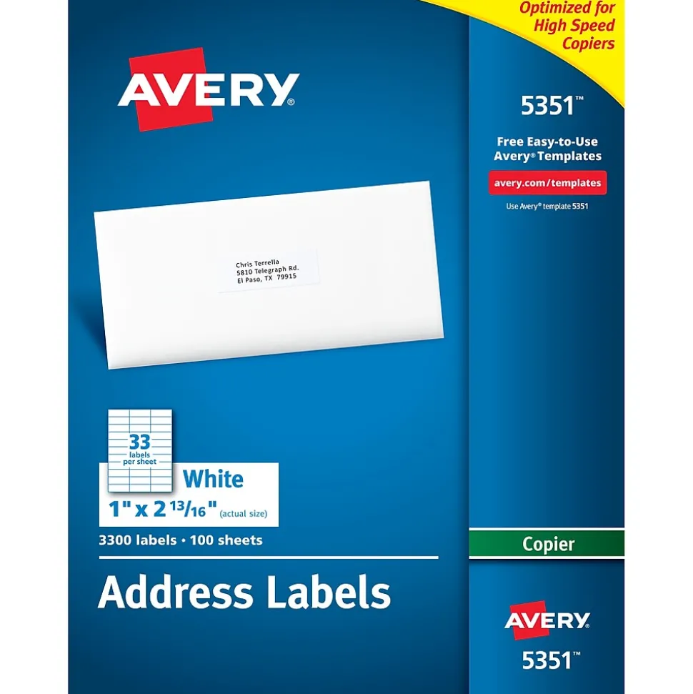 Creating visually elegant projects often needs engaging labels. Produce appealing labels with Avery Address Labels for Copiers. Having a label without a strong stick can ruin any project. Designed to stick and stay, the copier labels include a permanent adhesive that can hold onto most smooth surfaces. Creating your customizable address labels is made easy with the free designs, templates, and mail merge tools found on avery.com/templates. These white multipurpose labels are perfect for creating mailing labels and return address labels. Along with mailing labels, the customizable address labels can help create product labels, crafting labels, bin labels, organization labels and more. The printable labels are optimized for high-speed copiers. Large scale printing does not need to be daunting. To mass print your labels, simply create a master sheet and print your desired amount of copies. Each of the individual labels are sized at 1″x 2-13/16″. The pack includes 3,300 labels.
