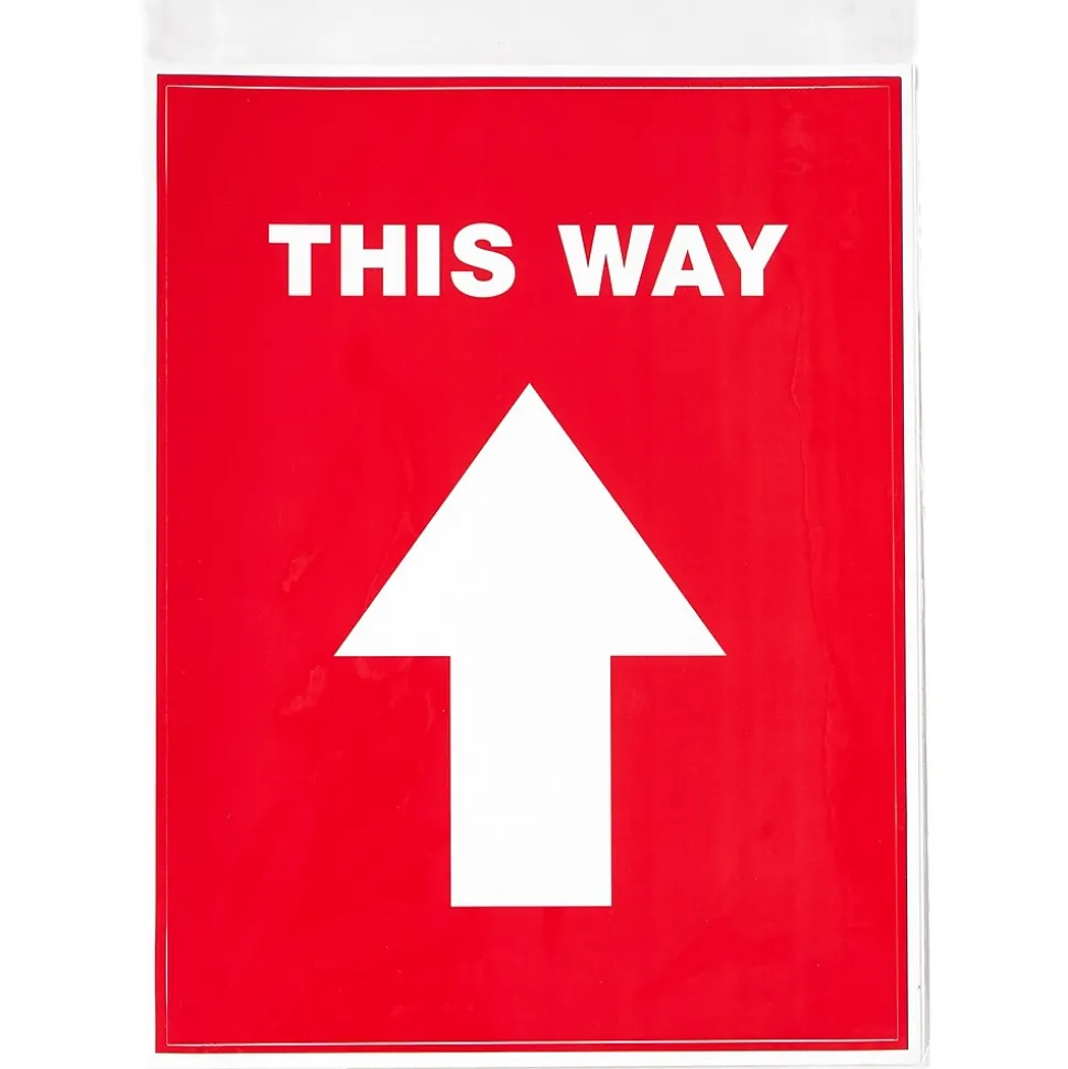 - “This Way” social distancing sign decals feature a white arrow on a bold red background with a semi-glossy finish
