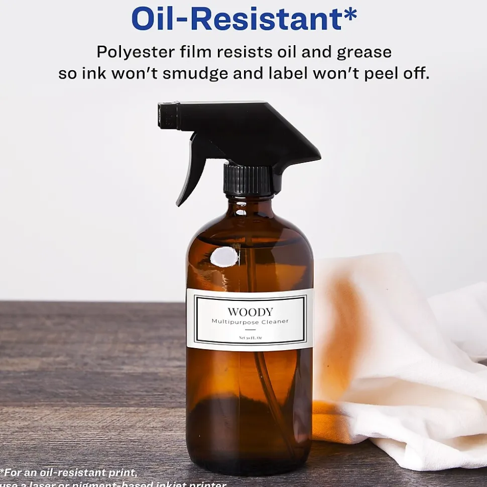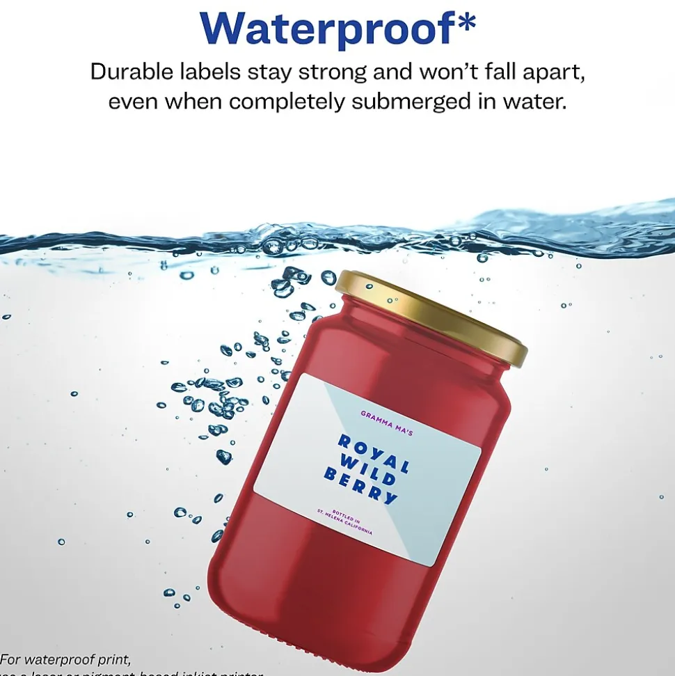 Designed to withstand the elements and tough conditions, durable waterproof Avery rectangle labels are perfect for making sure that your products and projects stay protected. These labels are completely waterproof and able to stay intact even when submerged in water. Great for food applications, these durable labels are temperature resistant, oil resistant and also withstands damage from scuffing, tearing and smudging. Also chemical resistant, these labels make it easy to wipe away viruses and germs with multipurpose cleaners and disinfecting wipes. Each sheet of labels also features Sure Feed(R) technology which helps deliver a more reliable feed through your printer to prevent print misalignments and paper jams. The print-to-the-edge label layout makes it easy to print beautiful designs that fill the entire label without a white border. A strong permanent adhesive is used to make sure that these labels stick and stay to paper, cardboard, plastic, glass, metal and more without curling or falling off. Avery Design & Print makes it easy to create customized labels from your own home or business. The free browser-based software has everything you need to design food labels, lotion labels, hand sanitizer labels and more. Try it out today at avery.com/templates. Please Note: Avery durable waterproof labels are compatible with laser printers and pigment-based inkjet printers but are not compatible with traditional dye-based inkjet printers. Ink from dye-based inkjet printers will smear when exposed to water. Please check your printer’s manual to confirm if you are using pigment-based ink.