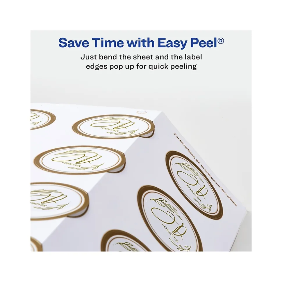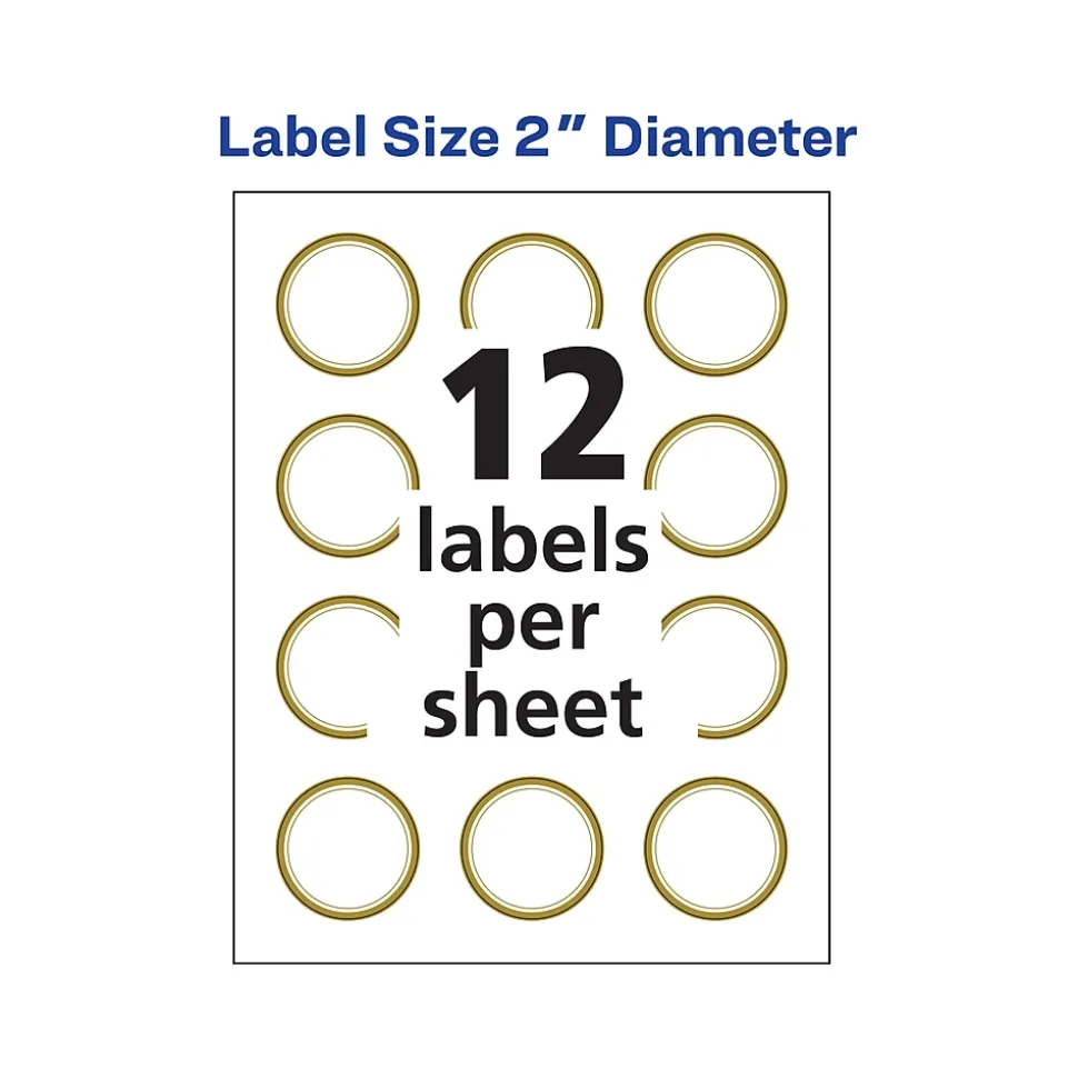 Remarkably reflective and elegant, Avery matte white round labels with metallic gold borders bring a strikingly radiant shine to any event or project. Each round label is pre-printed with a brilliant gold foil-like border that is guaranteed to capture people’s attention. Pair these labels with other Avery labels and cards with metallic gold borders for the complete look. Avery Easy Peel technology makes it simple to easily peel and place multiple labels quickly. Just bend back the label sheet to expose the pop up edges and peel away each label without risking ripping or tearing. Using a strong permanent adhesive, every label can stick and stay to a variety of surfaces including envelopes, cardboard, paper, glass, metal and more. Create beautiful designs and make your own mailing seals, mason jar labels, product labels, food labels, party favor labels, save the date stickers and more using the free design software and templates at avery.com/templates. 120 labels are included with 12 labels per sheet on 10 sheets. Compatible with both laser and inkjet printers.
