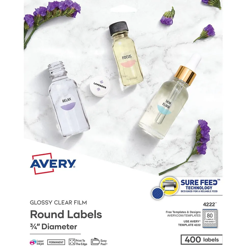 Give your product or handmade gift a custom printed on look with Avery crystal clear round labels, best when applied to white or light colored surfaces. Our print-to-the-edge capability allows you to create bright, eye-catching full-bleed labels with sharp text and crisp images printed right to the edge of the round sticker label with no border or margin. Each sheet of labels features Sure Feed(R) technology which helps deliver a more reliable feed through your printer to prevent print misalignments and paper jams. Our round printable stickers are quick and easy to apply with our patented Easy Peel label sheets with Pop-up Edge. Simply fold the sheet back to display the label edges for convenient and fast peeling that saves time and avoids label waste.A strong permanent adhesive is used to make sure that these labels stick and stay to paper, cardboard, plastic, glass, metal and more, without curling or falling off. Compatible with both laser and inkjet printers. Avery Design & Print makes it easy to create customized labels from your own home or business. The free browser-based software has everything you need to design pricing labels, planner stickers, gift label stickers, and labels for beauty products, essential oil, candles, soap and more. Try it out today at avery.com/templates. Try it out today at avery.com/templates.