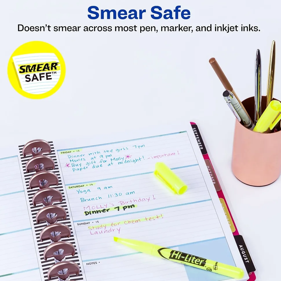 Use these fluorescent yellow chisel-tip pen-style highlighters to make key points stand out. These Avery Hi-Liter fluorescent yellow highlighters feature a chisel-tip design that lets you create thin and thick lines depending on the angle for underlining or highlighting important text.