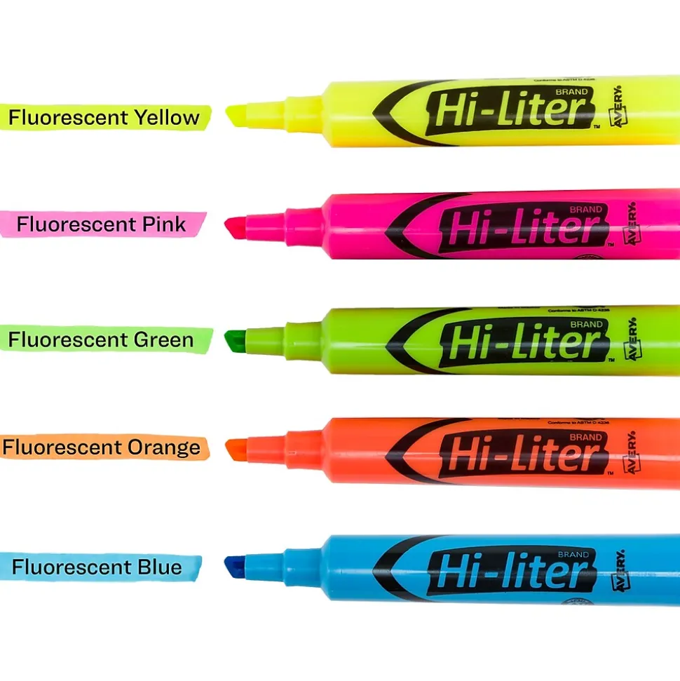 Draw attention to key words and phrases with these assorted-color nontoxic highlighters. With a chisel tip, these HI-LITER desk-style highlighters make it easy to create precise strokes, while the smear-resistant ink formula provides crisp, clear strokes.