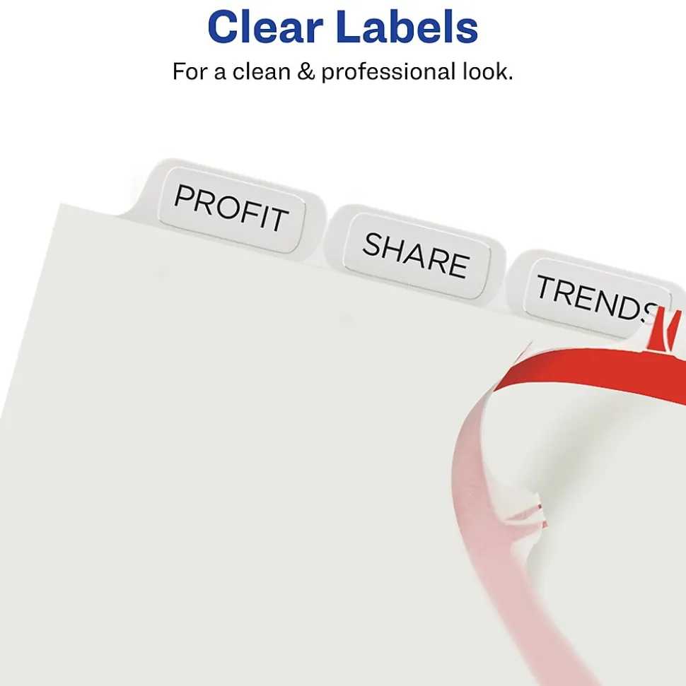 - Get a professional, printed-on look with clear labels that virtually disappear on the white divider tabs