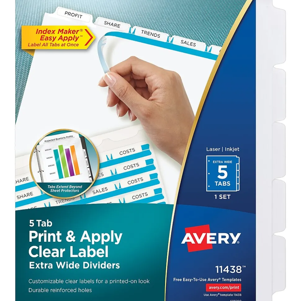Don’t waste time and money ordering custom printed binder dividers with tabs when you can easily create and print your own personalized dividers with Avery Index Maker Clear Label Extra-Wide Dividers. These larger 9.25″ x 11.25″ dividers extend past standard sheet protectors, so tab titles remain visible for quick and easy referencing. Customize your title tabs quickly and easily using the free templates on the Avery website and print with your inkjet or laser printer for clean, professional looking results in minutes. This pack comes with one set of 5-tab dividers, and the Easy Apply clear label strips make it simple to apply all 5 labels at once. Just print, align labels against tabs, smooth down labels and peel up strip. Each 3-hole punched durable divider also features doubled-sided, reinforced tabs and edges to help resist tearing for long-lasting, everyday use. These 3 ring binder dividers with tabs are a great addition to your medical office supplies, school binders, personal organizers, tax office supplies, presentation reports and more. Print, peel, and press your way to a perfect, precise project.