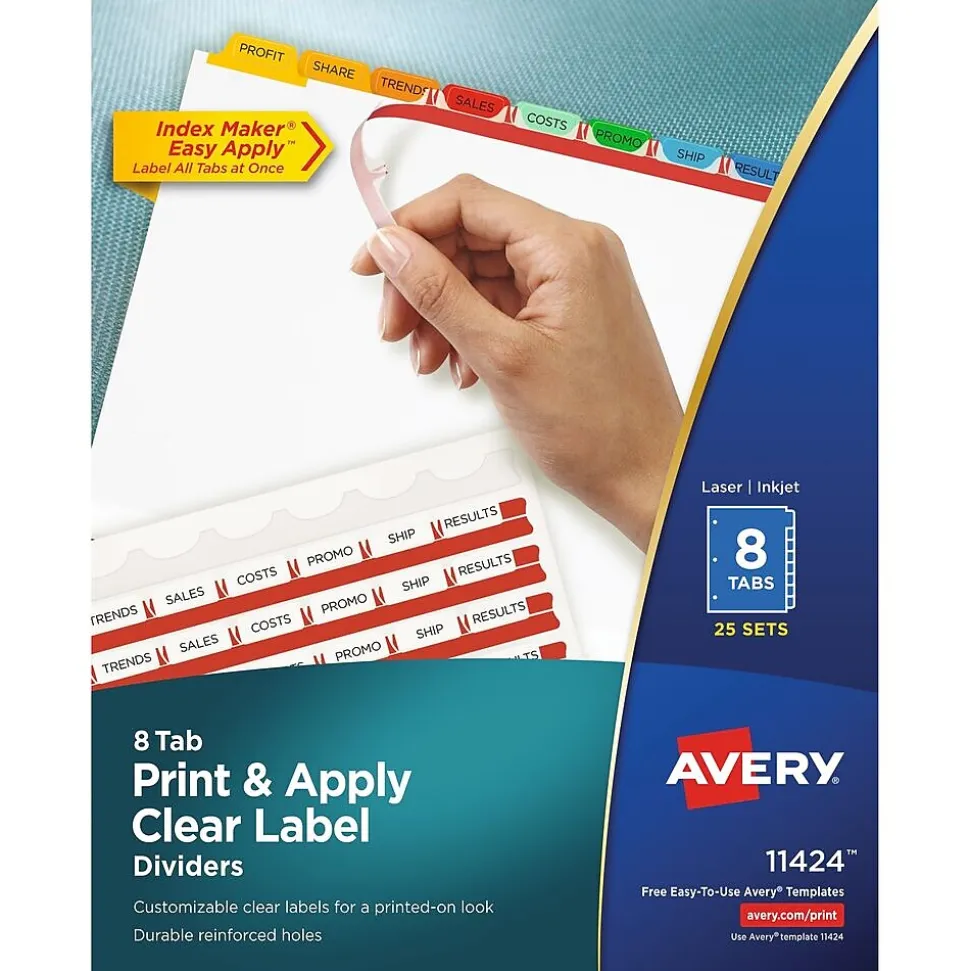 Easily create print shop quality personalized binder dividers with tabs using Avery Index Maker Clear Label Dividers. Customize the title tabs for your dividers quickly and easily using the free templates on the Avery website and print with your inkjet or laser printer for clean, professional looking results in minutes. This pack comes with 25 sets of 8-tab dividers, and the Easy Apply clear label strips make it simple to apply all 8 labels of each set at once. Just print, align labels against tabs, smooth down labels and peel up strip. The white binder dividers feature an assortment of brightly colored tabs for eye-catching convenience when you’re looking for the right section. Each 3-hole punched durable divider also features doubled-sided, reinforced tabs and edges to help resist tearing for long-lasting, everyday use. These 3 ring binder dividers with tabs are a great addition to your medical office supplies, school binders, personal organizers, tax office supplies, presentation reports and more. Print, peel, and press your way to a perfect, precise project.