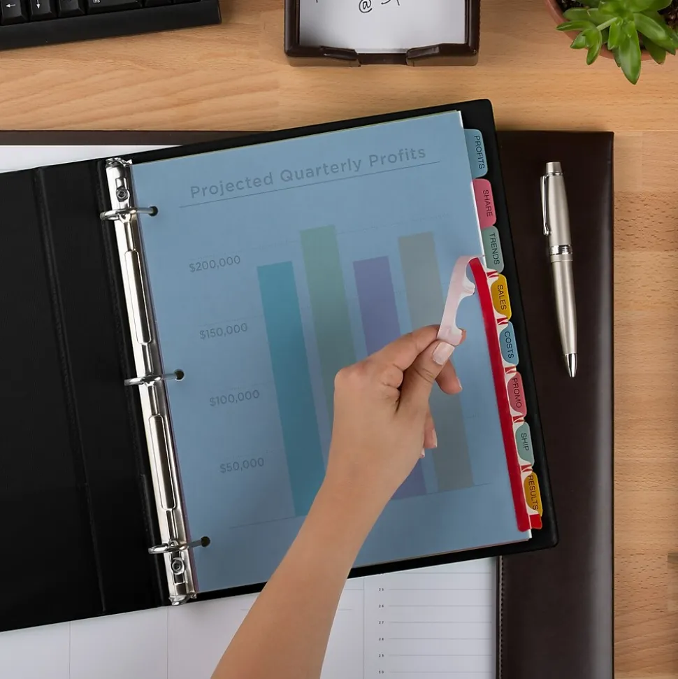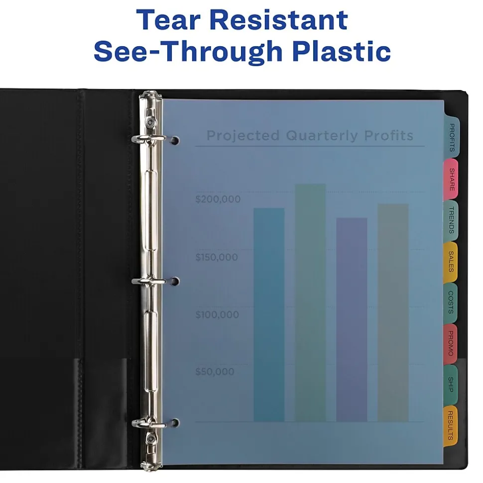 - Get a professional, printed-on look with clear labels that virtually disappear on the multicolored divider tabs