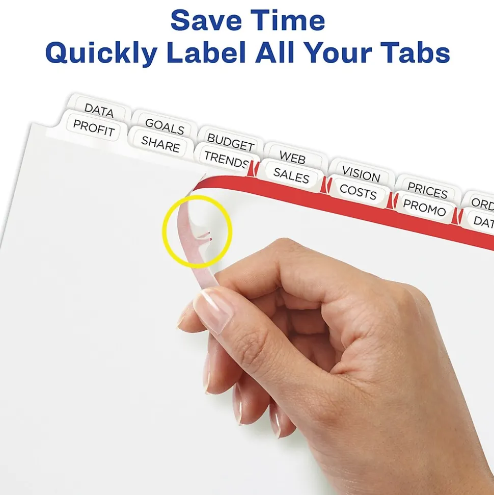 Whether you’re coordinating a single project or multiple sets, these dividers let you to get it done quickly and easily, with professional results. They feature an innovative double-layer tab format that is easy to view and access. They’re ideal for large projects, training and reference manuals, policies and procedure manuals, budget binders and client binders where multiple tabs needed. The clear labels virtually disappear on the tabs, giving your dividers a clean, printed-on look. Save time with the Easy Apply strip that lets you label all the tabs at once, making it simple to create custom dividers right from your computer. Just use the free templates at avery.com/print to easily personalize and print your tab labels in minutes. These dividers are the perfect tool for your organizing needs.
