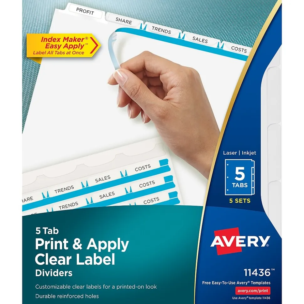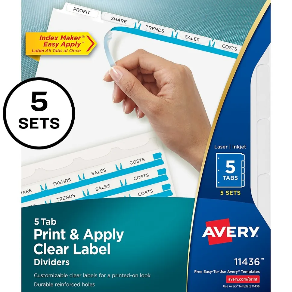 Easily create print shop quality personalized binder dividers with tabs using Avery Index Maker Clear Label Dividers. Customize the title tabs for your dividers quickly and easily using the free templates on the Avery website and print with your inkjet or laser printer for clean, professional looking results in minutes. This pack comes with five sets of 5-tab dividers, and the Easy Apply clear label strips make it simple to apply all 5 labels of each set at once. Just print, align labels against tabs, smooth down labels and peel up strip. Each 3-hole punched durable divider also features doubled-sided, reinforced tabs and edges to help resist tearing for long-lasting, everyday use. These 3 ring binder dividers with tabs are a great addition to your medical office supplies, school binders, personal organizers, tax office supplies, presentation reports and more. Print, peel, and press your way to a perfect, precise project.