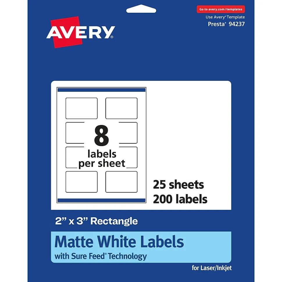 Matte white Avery labels are the perfect choice for any project. The smooth, matte white finish is a great fit whether you’re designing product labels, shipping packages for work, making party favors or adding a creative touch to personal crafts or school projects. Each sheet of labels features Sure Feed(R) technology which helps deliver a more reliable feed through your printer to prevent print misalignments and paper jams. The print-to-the-edge feature makes it easy to print beautiful designs that can reach the edges of the label without a border or outline. Quickly apply these labels with our patented Easy Peel label sheets with Pop-up Edge. Simply fold the sheet back to display the label edges for convenient and fast peeling. A strong permanent adhesive is used to ensure that these labels stick and stay to paper, cardboard, plastic, glass, metal and more without curling or falling off. The versatile label shape can adapt to almost any use, just create your design with our free software and print. Avery Design & Print makes it easy to create customized labels from your own home or business so that you can print professional designs with your laser or inkjet printer. Our free browser-based software includes predesigned templates as well as tools for editing text and images so that you can create food labels, body scrub labels and more. Try it out today by searching for Avery template Presta 94237 at avery.com/templates.