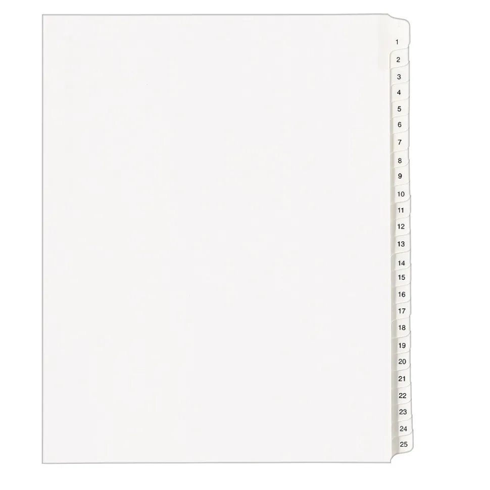 Quickly sort piles of legal documents and notes alphabetically with Avery 01701 1-25 legal exhibit dividers with Allstate-style design. Printed in numerical order with one number per tab, each tab is also printed on both sides for better visibility as you flip through your documents. The font of each tab is printed to match the Allstate style with Helvetica regular type. Avery dividers feature tabs reinforced with clear Rip Proof technology that ensures that the tabs can survive everyday wear and tear. Unpunched for universal compatibility, the binding edge is left intact so that they can be hole-punched to fit with any binding system. 1 set of 25 dividers is included. Whether you are an office admin maintaining a system of records, an attorney keeping track of notes or a paralegal organizing vital documents, Avery dividers are just the right supplies you’ve been looking for to organize your life in style.